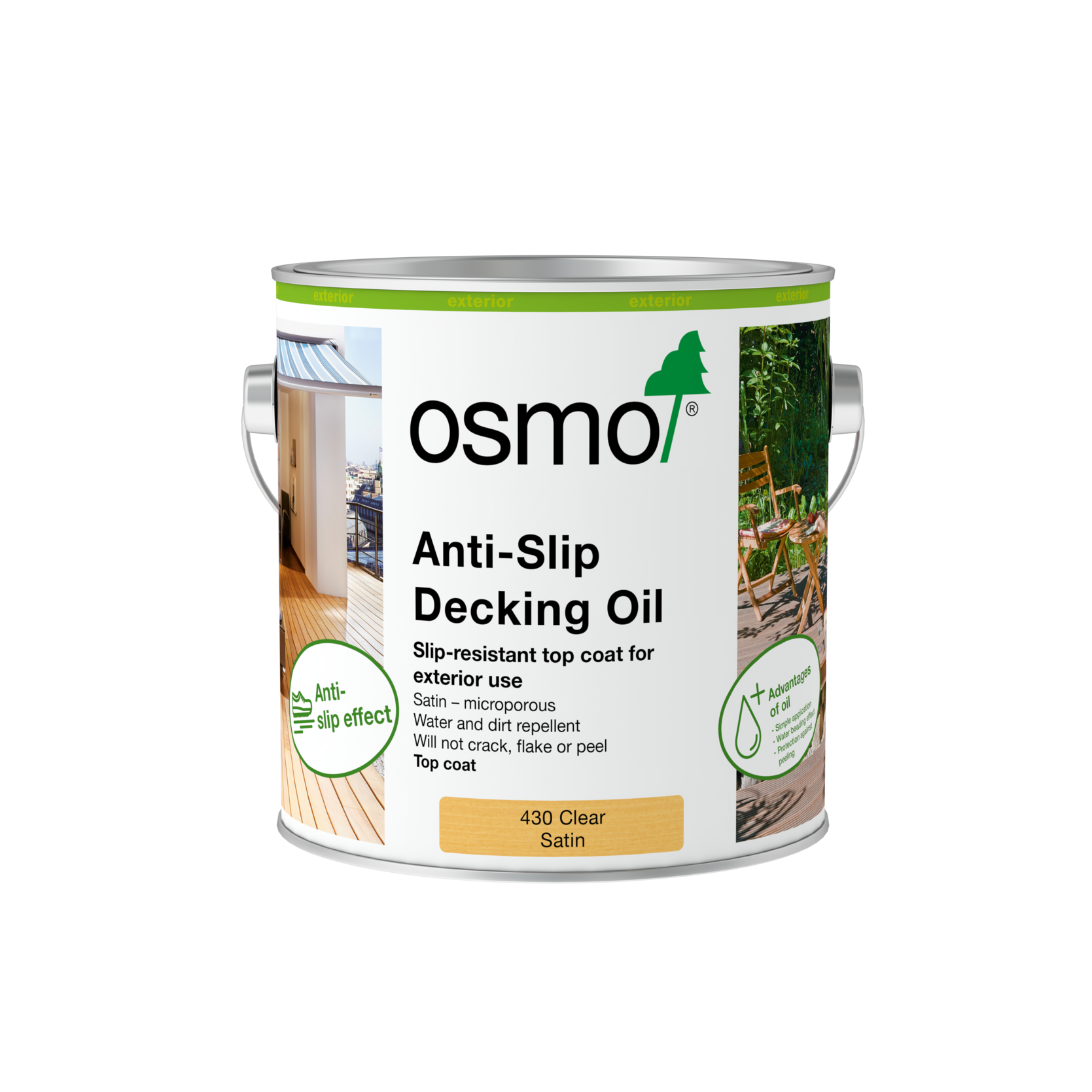 A 2 coat application, this product is designed primarily as an anti slip finish for use in commercial situations such as an exterior timber deck attached to a cafe, which may become wet and slippery, or any area where an anti slip finish is required, such as around a swimming pool etc. Osmo Anti Slip Decking Oil 430 offers no UV protection and the finish will need to be reapplied every 2-3 months in areas which are fully exposed to the weather.Â